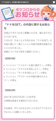 2021年12月15日18時のお知らせで、やることメモにあるドナをGETの内容変更が告知されました。